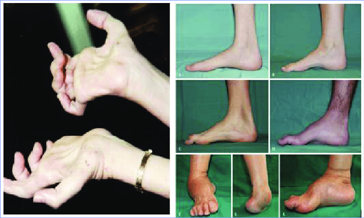 The Role of Mutations in Genes PMP22, MPZ, LITAF, EGR2, NEFL, MFN2, KIF1B, RAB7A, LMNA, TRPV4, BSCL2, GARS, HSPB1, GDAP1, HSPB8, DNM2, PRX, MTMR2, SH3TC2, SBF2, NDRG1, FGD4, FIG4, YARS, GJB1, PRPS1, in Charcot-Marie-Tooth Syndrome – Scientific Figure on ResearchGate. Available from: https://www.researchgate.net/figure/Overview-of-Skeletal-Disorders-in-the-Legs-and-Hands-of-Patients-with-Charcot-Marie-Tooth_fig4_339325328 [accessed 25 Jul, 2021]