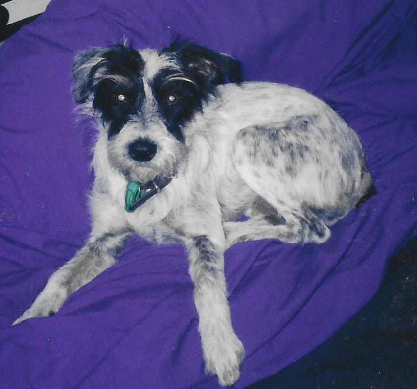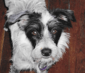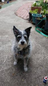 We get to a kennel where a little dog is sleeping, its back end facing us. It had the same black, white and greyish colouring of a blue heeler. “Another cattle dog puppy” we said. But then the little scamp lifted its head and looked at us. And there we saw the sweetest little face with ears still floppy with youth, and, oh my gosh, the cutest little terrier beard!